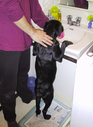 「ウチに来るか?」と聞くと、そいつはムチのような長い尻尾をブンブンいわせた・・・。 決して水入れからは飲もうとしない黒光りするニクいヤツ。それにしてもなんでコイツの背筋はこんなにピンと伸びているのか?ナゾだ。ちなみに手はあくまでも添えているだけ。 (2001/03/25)