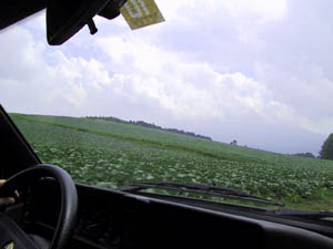 1000mを切った途端にフェーン現象のまっただ中に入る。 慌てて山側にとって返す。 気が付くと、 ぐるっと360度キャベツ畑。ちょっと風。 (2001/07/21)