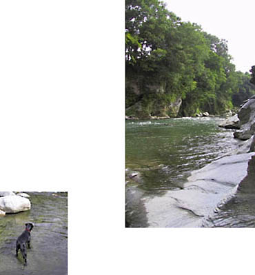 …ナニ狙ってるんですか? 景勝地として見ちゃうとなんてことない。けど地質学や、水遊びの場としてはとっても意味のあるところらしい。確かに懐かしい気がした。川なのに海にも似ている。 もちろん犬だって大喜び。7月の暑い日。(2001/10/01)