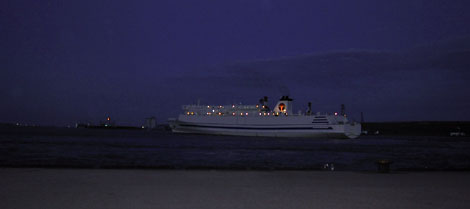 お台場から有明を超えて南端に走ると、フェリー埠頭に行き着く。 北海道や四国、九州に長距離フェリーが出るところ。 フェリーって、なぜか夕方に出航するイメージ。 この日も夕方、一隻出ていくところに遭遇。 山の様な巨体がみるみる遠ざかる様。 向こうに見える丘は、東京でもっとも新しい廃棄物処理場(ゴミ捨て場)。 地図で見るとお台場の2倍ぐらいある。 (2001/10/30)