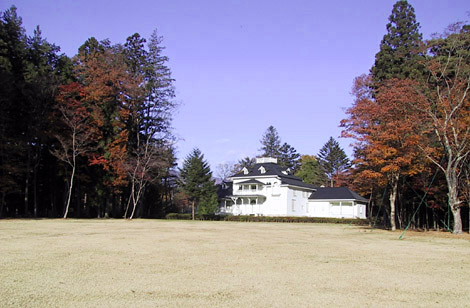明治時代の外交官、青木周蔵の別邸。 設計は松ケ崎萬長。 今は西側に道の駅が隣接している。 写真左側の杉は、別邸正面へのアプローチの並木道の一部。 (2001/11/20)