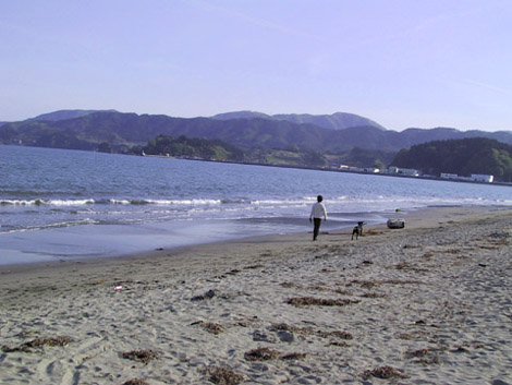 このぐらい広いと ノーリードもノーコントロールも関係ない。 10m離れてたって犬と僕は一緒だ。 そう、もともとこのぐらいの広さが僕らにはちょうどいい。 あの半島を超えると僕の育ったまち。 (2002/05/09)