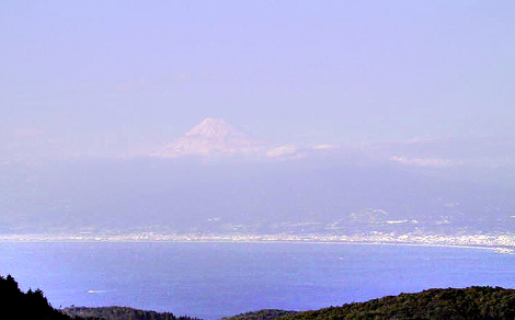 元旦、初日の出が見込めそうもないので 初富士を見に出かけた。 昼近くまで西伊豆で粘って やはり無理か…とあきらめかけた頃 達磨山から、やっとこれだけ顔を出してくれた。 駿河湾に浮かぶ、日本一の山。 (2003/01/09)